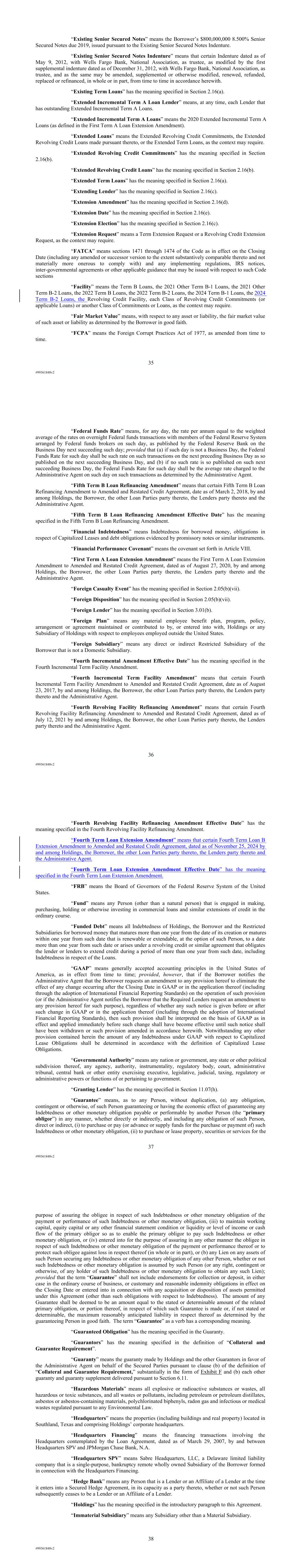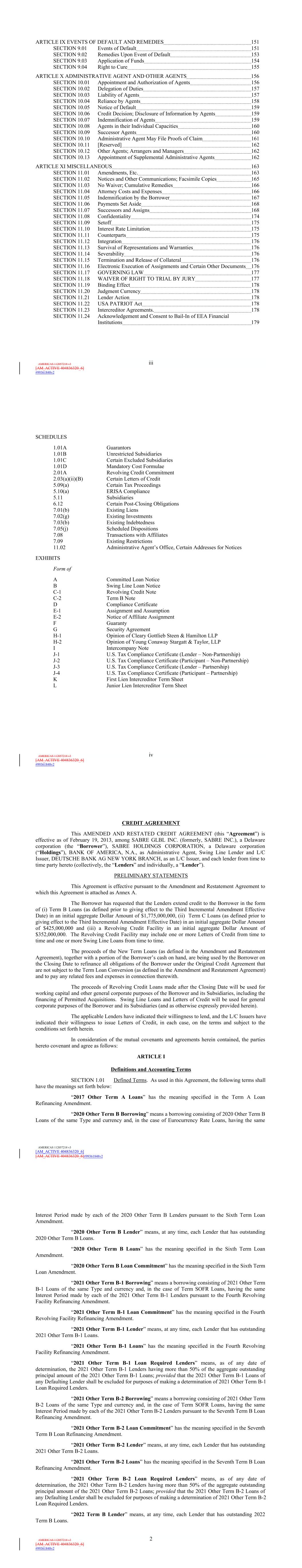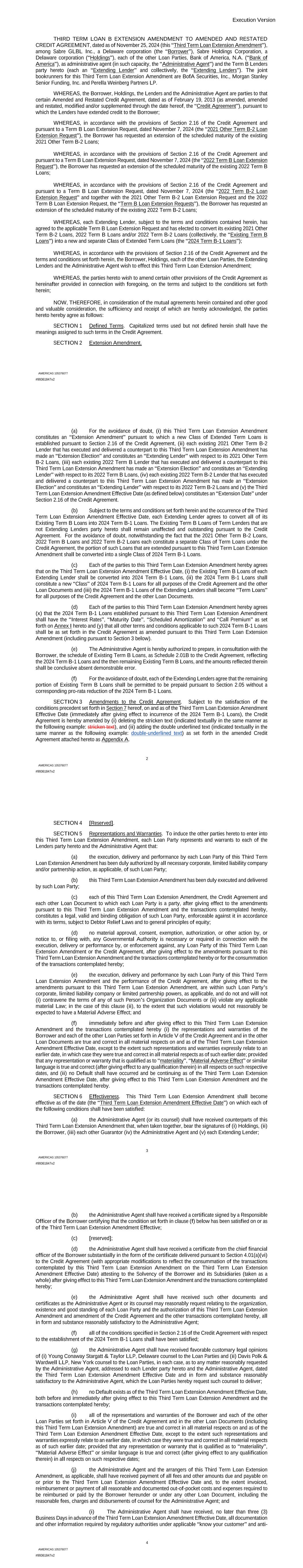 | 10.122 | | Term Loan Credit Agreement, dated as of June 13, 2023, among Sabre Financial Borrower, LLC, as borrower, Sabre Financing Holdings, LLC, as holdings, the subsidiary guarantors party thereto, the lenders party thereto and Wilmington Trust, National Association, as administrative agent (incorporated by reference to Exhibit 10.1 of the Sabre Corporation’s Current Report on Form 8-K filed with the Securities and Exchange Commission on June 16, 2023). |