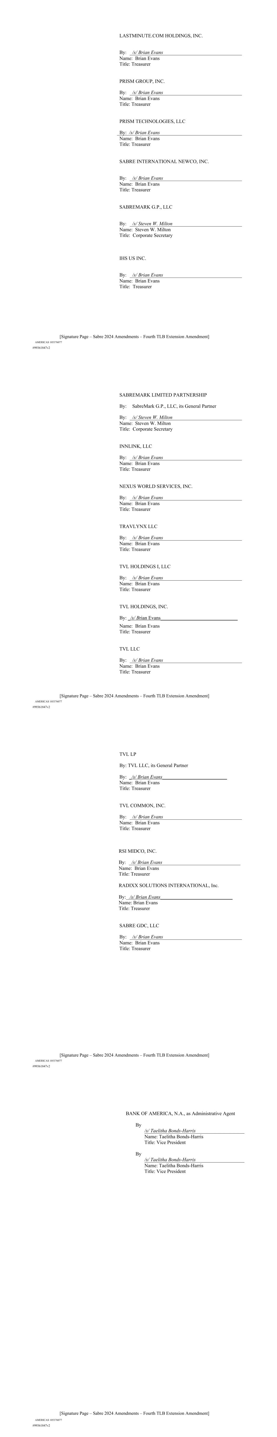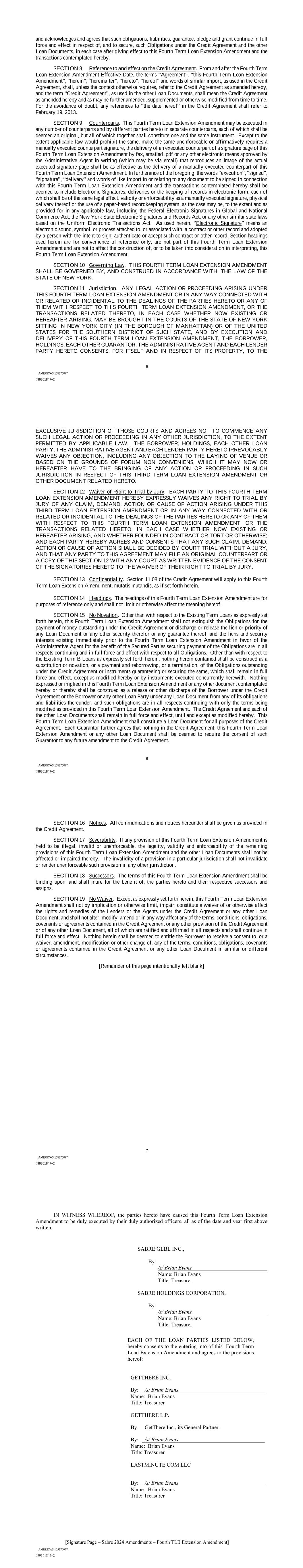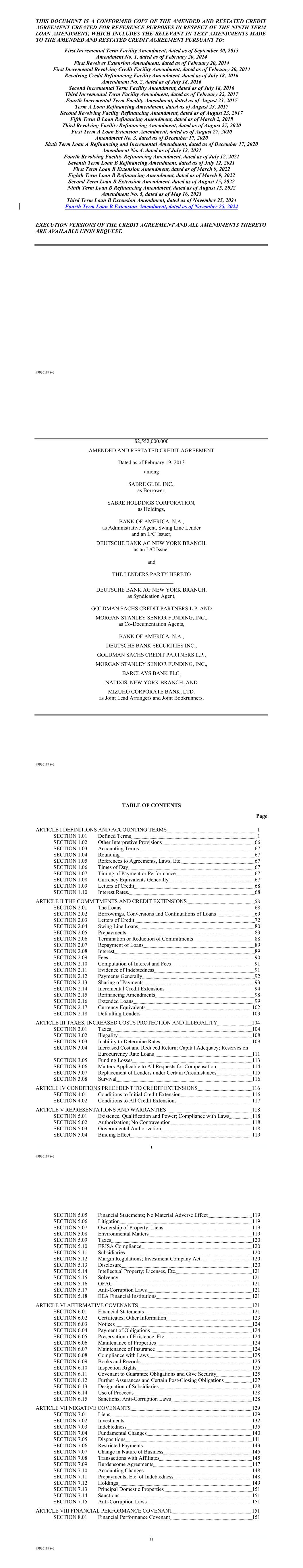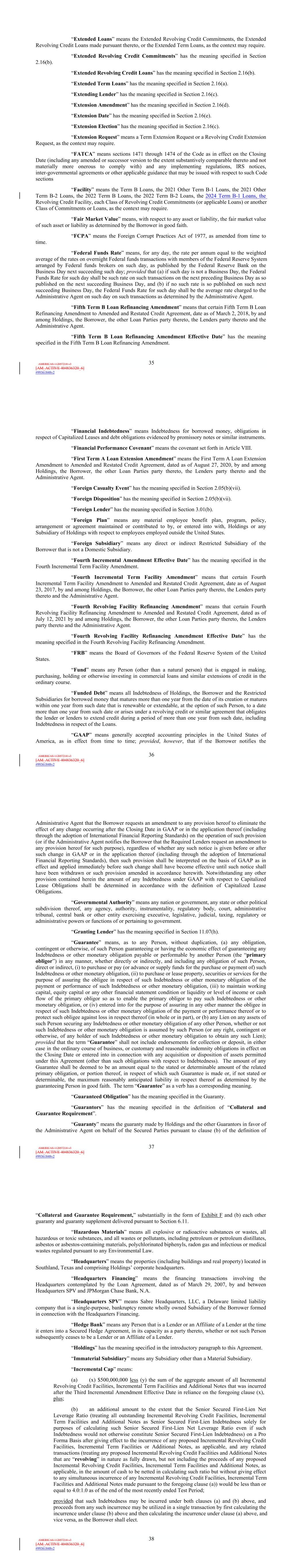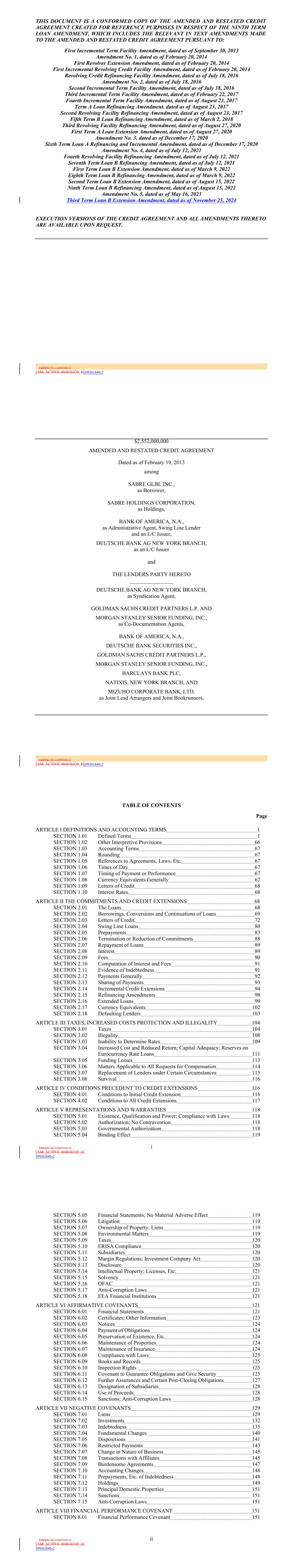 | 10.124 | | First Lien Pari Passu Credit Agreement, dated as of June 13, 2023, among Sabre GLBL Inc., as borrower, Sabre Holdings Corporation, as holdings, Sabre Financial Borrower, LLC, as lender, and Wilmington Trust, National Association, as administrative agent (incorporated by reference to Exhibit 10.3 of the Sabre Corporation’s Current Report on Form 8-K filed with the Securities and Exchange Commission on June 16, 2023). |